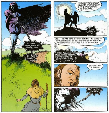 Will’s favourite panels: Morpheus’s first reveal with his cloak blowing in the wind (whatever happened to wearing cloaks? Cloaks are awesome), the sequence of the door in the hill opening and faerie stepping through, the look of shock on the guy playing Theseus’s face when he sees the audience, Titania looking at Morpheus out of the corner of her eye a lot, Peaseblossom being made to shut up, Robin Goodfellow’s Cheshire Cat grin in the second last panel.