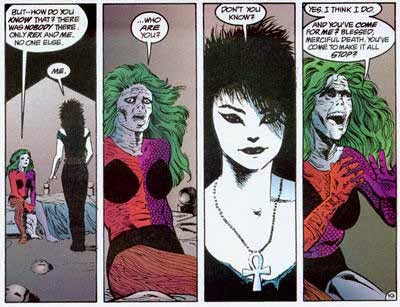 I’d admit at this point that I didn’t even realise that the main character of Façade was some Z-List superhero (like Loz says: Element Girl) when I first read but still – man – it was like a punch deep in the guts. I’d perfectly happy to say that yeah – reading it first as a teenager probably helped a whole bunch (I mean – teenagers know what it’s like to be alone, to be stuck inside, to think that life is hopeless, way more than any other demographic – right? Or was that just me?) but yeah – the way that the whole thing kinda unfolds is just so – well – can I say cool? It’s like the set-up for a joke or something: everything there just to tighten the noose just a little bit more…. And then – well – yeah – Death shows up.
