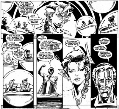 As for the writing, the third book is basically a retelling of Joe Haldeman’s excellent science fiction novel ‘The Forever War’ (a brilliant read even if you’ve read the comic) although with the sexes reversed. This isn’t a criticism, what Moore has in common is that unlike many other comic writers, he’s read a lot of books and is more influenced by them than other comics. He’s also good at ensuring he always stirs something extra into the conceptual mix rather than just ripping off his influences, for example, in this case, by reversing the sexes. And another thing he did better than anyone else at the time was long term plotting. The war was introduced in the background in the earlier stories, only coming into view in the third book. This is fairly commonplace nowadays but was pretty much unheard of in comics at the time. Thinking about it, telling a story that took two years to play out must have seemed a pretty risky editorial decision at a time when it was assumed comics were things kids grew out of…