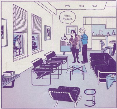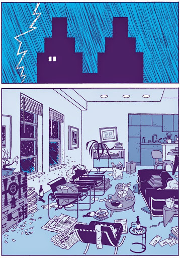I did love the way the art supported the story, AP all in blue geometric lines, Hanna all in red lines, and the way the room around them matched each person, but also segued/switched from one to the other. I think that got the effect of the dolly-zoom, and it shows how in an argument you focus in on your own point of view, becoming unable, when you are hot and bothered, to even see that there might be another point of view.