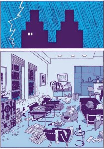 There are so many incredible techniques and subtle touches in there. More than I could ever cover, but I was just looking at the end, when Asterios turns up at Hana’s place. She covers him with the blue (pre-fire Asterios) blanket, then, as she warms to him after he tells her he’s given up smoking, she puts a neutral yellow blanket on top of it. The blankets come off altogether after she reveals the platonic solids and the two of them stand, bathed in a blue glow. It’s a nice moment that shows he’s had as much of an effect on her as she has on him.