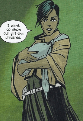 Picking up on a point that Christine made, I’d be tempted to think that Alana’s people may be “super”human based on how Alana is able to get up and go right after giving birth in the first few pages. However, I’d suppress that thought by remembering that;