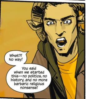 I don’t have Saga in front of me so I’m limited to the things I remember, and I just remembered a good joke.