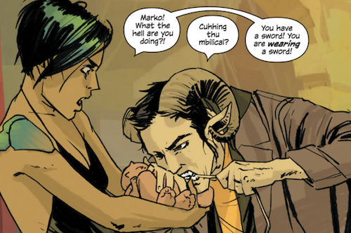 Also the pictures included here are such fun, the part about ‘cuhhing thu mbilical?’ is really funny (you are WEARING a sword, neat segue into the vow), and it’s a pity (albeit topical) to include the bit about Marko saying ‘no more barbaric religious nonsense!’ without including Alana’s look: ‘it’s not religious it’s cultural’.