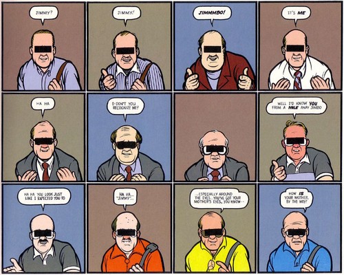 But wait. I mean – I said I was going to be honest – yeah? (Yeah). Well – then I’ll admit at this point that this wasn’t a book that I was partially looking forward to reading (again or rereading or whatever). Most of the time reading a comic – it’s something to look forward to: it’s a pleasure you know? Something to be done for fun (yay fun!). But this book – I dunno: it wasn’t quite that it felt like work: but it definitely felt more like something I had to do rather than something that I wanted to do. Like (I guess) a fisherman who knows that there’s a really big fish out there that kinda got away from him a while back and now (this time round) I was kinda determined to land it – take it home – and display it proudly on my mantelpiece (the mantlepiece being this blog I guess: “How big was it?” “Hell – this big.” etc). And so yeah – even tho there’s that stuff at the start and it’s pretty funny and stuff – once it starts: I dunno – there was a feeling like listening to the first few notes of a some jazz concept-album (jazz concept-double-album) or watching the opening credits for some obscure three hour experimental french film: a feeling of – how tough exactly is this going to be? And: what am I letting myself in for? (Is it too late to stop? Or is my seat-beat too firmly fastened?)But yeah – then the fun house doors swing open and it’s too late to leave. So.And yeah: being honest. When it starts – it is a bit of a drag. Like – it’s tough. And hard going. If most comic book reading is like a happy little bike ride across sunny plains – then Jimmy Corrigan is more like climbing a particularly steep mountain in bad weather. It’s not that every step is difficult – it’s just one step after another – just – uphill: but you can feel the strain and you can feel yourself working as you go up. Puff. Puff. Puff. Ok ok. Come on – you can do this. You can do this.My thoughts during all this? Well. First of all it makes a lot of sense that it got those awards and all that lovely praise from all those distinguished sources: because mostly the things that Jimmy Corrigan reminded me wasn’t other comics – but the kinda of late 20th Century / early 21st Century highbrow literary novels that tend to get so much love from things like the Booker Prize (and that mostly I tend to pretty much avoid). I mean – I don’t know if someone somewhere has written off a checklist of things a book needs to do if it wants to get some critical love and respect but – well – Chris Ware sure seems to hit a lot of the right notes (not that I think he did this in a calculated way – I mean: I don’t think it’s been written in a cynical way – far from it – but still): there’s the troubled childhood stuff, there’s the intermingling of dreams and reality, there’s lots of mundane day-to-day stuff that’s captured in excessive detail (I imagine if Jimmy Corrigan was a book with no pictures then would be pages and pages of “lyrically descriptive”passages: I mean check that bit where the kid describes the exact way his dad laughs), there’s some very authentic-seeming historical flashbacks which is the kinda of thing that always appeals to that Hilary Mantel crowd and it’s pretty much non-stop with the misery and isolation and loneliness and modern ennui that afflicts pretty much everyone everywhere living in cities and stuff…