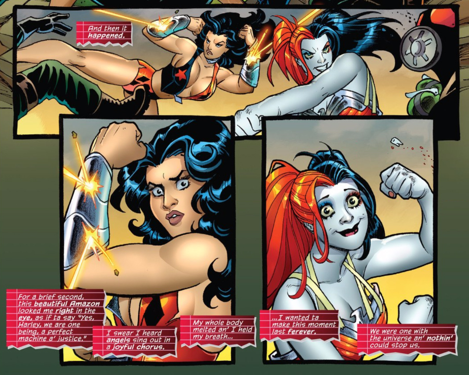 Instead, Conner and Palmiotti began building up the prominent usage of BDSM imagery and practice throughout the comic, and in some cases use Harley to tell their own version of Golden Age Wonder Woman stories. In the first arc gathering together the gang of Harleys, they hunted down a reimagined Captain Strong, who had become addicted to psychoactive seaweed granting him superhuman strength. Once Harley finally subdued him, she tied him up naked in a pretty clear bondage configuration and switched over into Dr. Quinzel mode, identifying herself as a doctor who was there to help him come down off the algae, offering him compassion and treatment instead of incarceration.