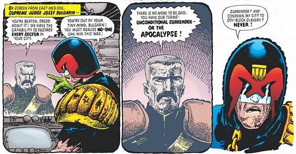 Because well yeah and even: Dredd isn’t good because it’s one long story and ages along with it’s readership: I mean – it’s good because it’s good for all sorts of reasons we haven’t even touched upon yet (oh man: the Apocalypse War: it’s Threads with LOLS: which is amazing. Special shout out to the panel where they take Dredd’s helmet off but there’s a guy in front of his face and you can’t see: but Sov Judge behind is all: “So THAT”S what he looks like.”: it’s basically the sort of thing that only the extremely po-faced couldn’t get a kick out of – or is that just me?).