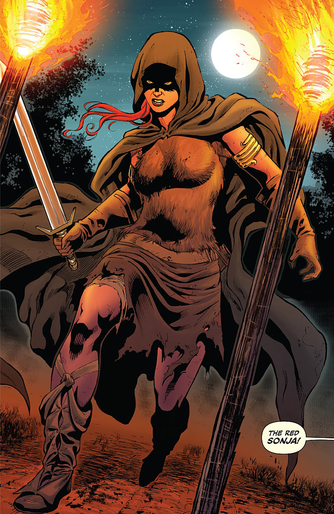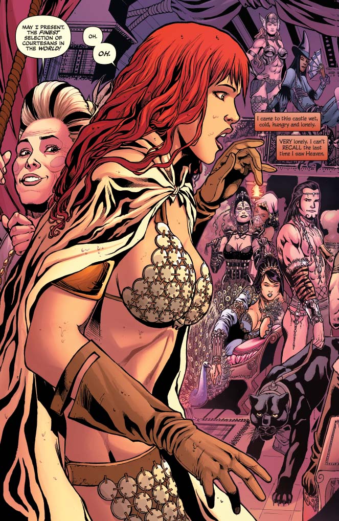 The darker aspects of the deal were hinted at in the previous attempt to reboot Red Sonja. This was Michael Avon Oeming’s run with Mel Rubi (with Mike Carey helping out at the beginning). The creative team suggested a novel explanation for the most ridiculous aspect of the character – her chainmail bikini. The traditional justification was that Sonja’s enemies would be distracted by the sexy, and so would be easier to deal with in a fight. Carey, Oeming and Rubi instead suggest that the costume is a kind of bait. Sonja invites attackers in order to punish their attempts to sexually assault her. Although this is left unarticulated by the creative team, by wearing the bikini Sonja is choosing to keep reliving her own rape. Even after she kills her rapist, rape revenge continues to provide a motive for everything she does.