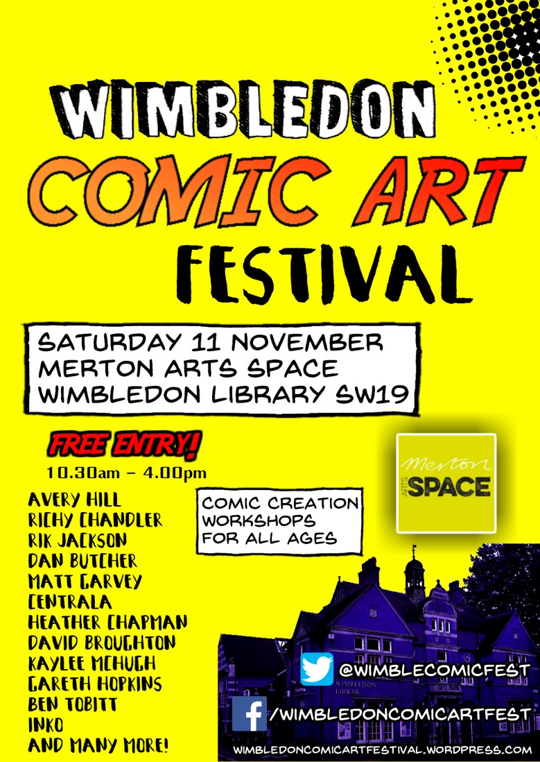 Wimbledon library turned the rear reference library room into a creative arts space earlier this year and it’s a perfect venue for a comic festival. They have done all kinds of things, from exhibitions to live music so the room is very versatile. Up until recently I lived right nearby and am still there a lot now. I draw my own comics there while my son does his martial arts classes and it’s a brilliant place to be creative.