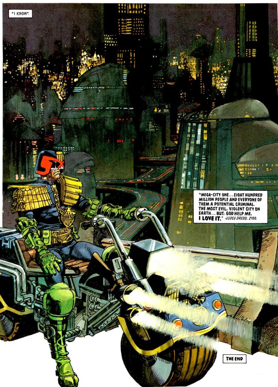 The first big main part of why I love it / why it has such a hold on me (as mentioned in the The Apocalypse War thread) is – holy shit it’s kinda hard to understate this but – all of Dredd is in continuity. Let me just say that again for those at the back: all of Dredd is in continuity. Which means that right from start back in 1977 (and when viewed in a certain kinda way) it’s all been telling one long story all the way to the present day. Which means that – even if you stop paying attention and then go back to it: it’s kept moving in your absence and changing and growing and getting bigger and stranger and more alive. Like when you buried a bottle of gunk in your back garden as a kid (different liquids and stuff all mixed together – or am I the only one who did that?) and then you go back to it a decade later and it’s turned into a miniature city with it’s own lingo and customs and and histories and entertainments and crimes and spaces and noises and sights and smells and people – that’s what reading Dredd now is like. It’s a multi-dimensional experience: because without even anyone planning to: Mega City One (and the rest of the world) got filled in and shaded in a thousand different ways bu hundreds of different people… (including Grant Morrison, Mark Millar, Garth Ennis, Steve Dillon, Simon Bisley, Ron Smith, Brian Bolland, Chris Weston, Chris Cunningham (!) and those are the first bunch that pop in my head and I’m already thinking of all the people I’m missing out…).