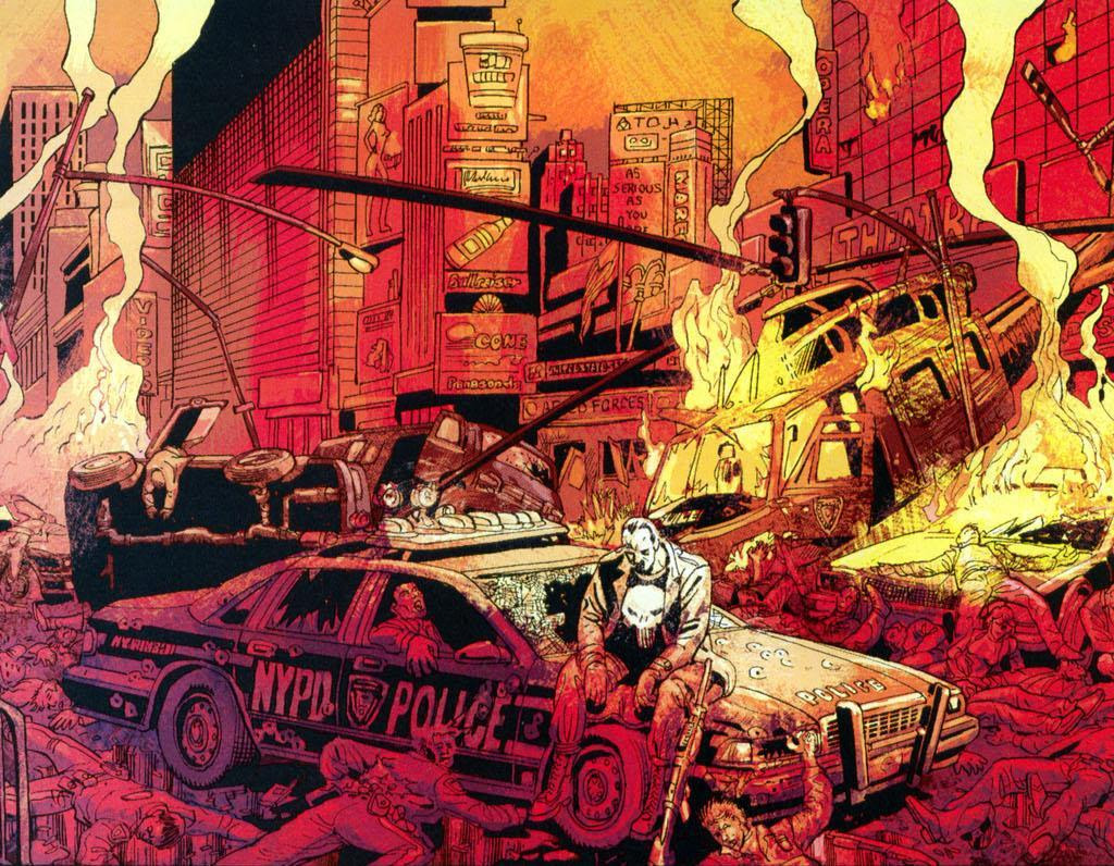 But anyway – yeah. What I can I say about this comic that I haven’t said before? I mean: if you’ve never read it before and you’re looking for something to fill up your lockdown days then I’d definitely recommend it whole-heartedly. I mean yeah it’s full of the old ultra-violence and Frank Castle is depicted as less a human being and more like an unstoppable force of something beyond nature which is all good and feels almost dangerous to read but the thing that leaves me feeling most impressed is the way how in the main body of the thing – Volumes 1 to 10 – Ennis manages this beautiful graceful seemingly impossible trick of making each volume top the one that came before and finding new wrinkles and new angles on this guy who really shouldn’t be able to give you that much – after all his only thing is that he kills bad guys and wears a cool shirt with a skull on it (I mean – no offence Frank: but you’re hardly Dostoyevsky). And yet and yet: Ennis keeps finding new notes to play and new places to put him in – What if The Punisher was going to join The War on Terror? What if The Punisher was in an 80s action movie? What if The Punisher finally snapped? What if the Punisher took on sex traffickers? What if the Punisher fought corporate crime? What if The Punisher faced the one target that he couldn’t shoot back? And etc. And yeah maybe when I sum it up like that it sounds kinda lame or gimmicky – but when you’re reading it: it just feels – smooth and natural and as gripping as a bear-trap caught on the top of your head.