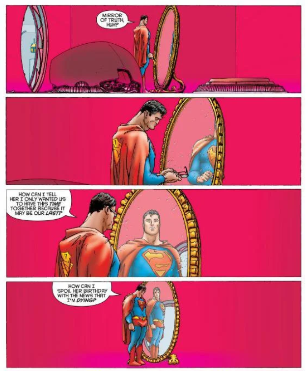 The other thing that I loved was what the friend who showed it to me focused on – there’s a panel where Superman is standing in front of some Mirror of Truth thingy, and the art shows how Clark Kent works as a disguise – how slumping over makes a giant man look like a doughball, where the Mirror of Truth obviously shows him as his heroic self, standing tall. It’s one of my favourite panels in any comic, ever.