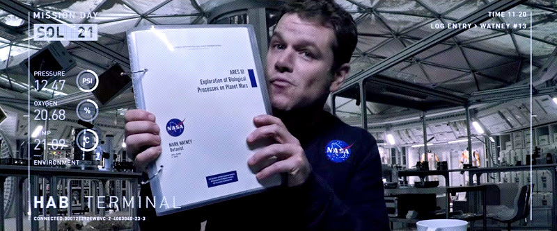 “I’ve been thinking about laws on Mars. There’s an international treaty saying no country can lay claim… to anything that’s not on Earth. And by another treaty, if you’re not in any country’s territory… maritime law applies. So Mars is international waters. Now, NASA is an American non-military organization. It owns the Hab. But the second I walk outside, I’m in international waters. So here’s the cool part. I’m about to leave for the Schiaparelli Crater… where I’m gonna commandeer the Ares 4 lander. Nobody explicitly gave me permission to do this… and they can’t until I’m on board the Ares 4. So that means I’m gonna be taking a craft over… in international waters without permission. Which, by definition, makes me a pirate. Mark Watney, Space Pirate.”