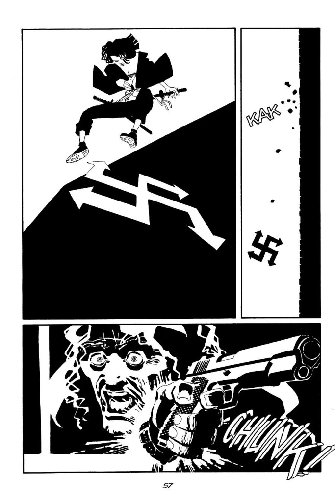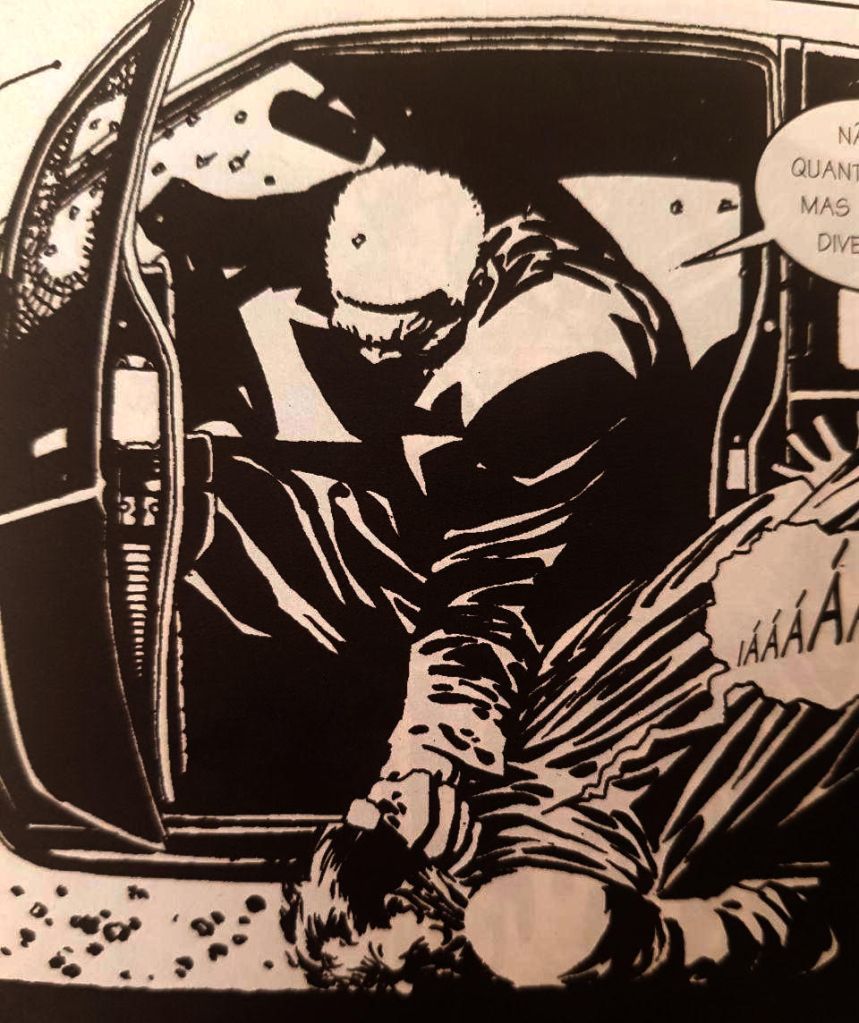 Miller adds a bit of ambiguity to this at the very beginning where Marv breaks into Lucille’s flat because “she knows what I need and she’s got it” – setting up the threat of sexual assault as a tension-builder. It’s quickly deflated, but it still reflects a view of the world where women’s sexuality is an ever-present danger to them. Marv constantly has to control and suppress his desires around basically every female character in the story. Wendy slaps him when Marv makes a move on her and he retreats – a submissiveness that shades into masochism when he allows himself to be pistol-whipped by the sex-workers in Old Town. There’s a dominatrix in the room to underline the point (again, nothing in the book is subtle). Marv’s masochism is set against the sadism of the villains – and that dichotomy is elevated into an ethic. Unfortunately, I suspect it’s something Miller actually subscribes to, but it’s nonetheless strangely fascinating to see his kinks laid bare.