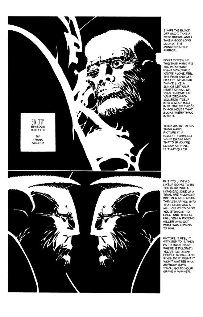 And Miller doesn’t there, he doesn’t simply use light in striking reverse. As he goes on, he begins to have fun with the perverse new reality he’s depicting and suddenly we get more twisted, expressive depictions of people. Not just the two page strip dance splashes – but Marv staring into his own mutilated image in the mirror.