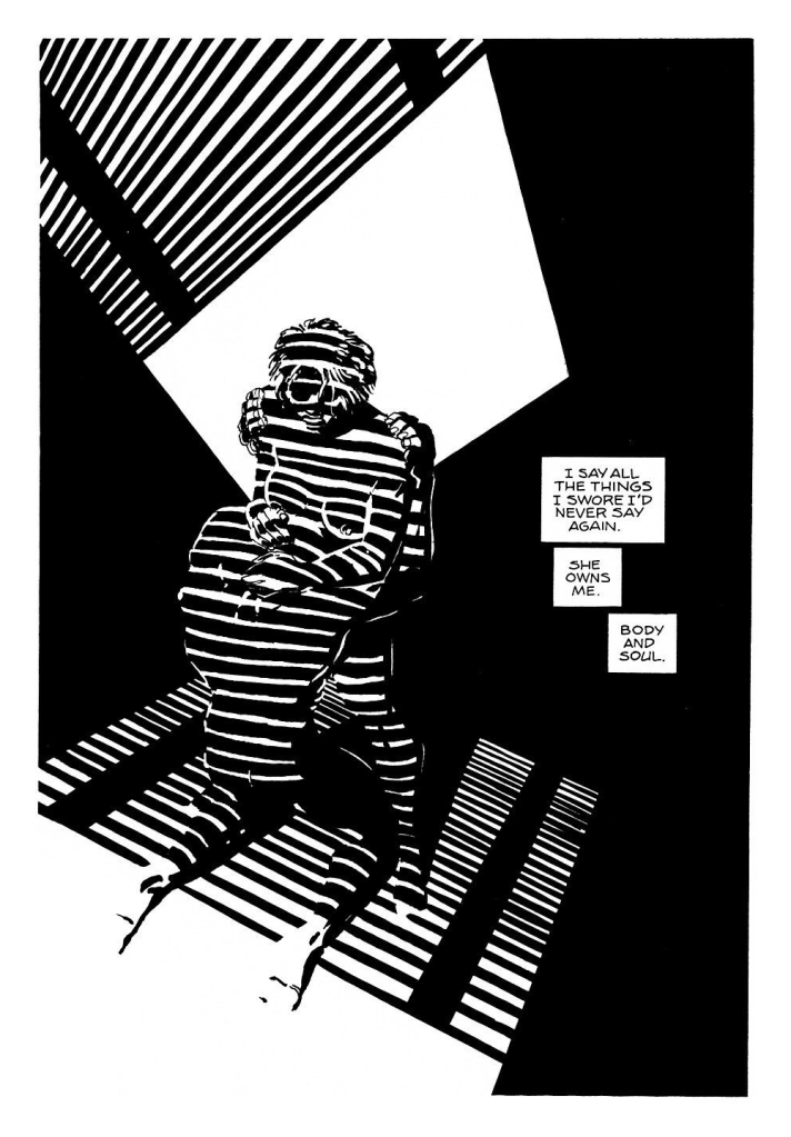 Of course in the same way that Watchmen and The Dark Knight Return spewed multiple countless imitators that could only grok the surface details and so started to churn out superhero stories with lots of swearing and unpleasant violence and sexual assault (BIF! POW! BAM!) Sin City basically birthed a whole comics industry where the basic idea wasn’t really much more than taking an Elmore Leonard book and adding pictures (yeah Ed Brubaker I’m looking at you) but compared to the experience of reading Sin City which is akin to chugging a whole pint of vodka straight out of the bottle the likes of Criminal feel more like taking little careful sips from a juicebox. I can’t remember where I read that the point of a story isn’t what it is but how it is. And yeah it’s a big part of Sin City that it’s about the underbelly and life on the wrong side of the tracks and punching and crime and guns and sexy ladies dressed in sexy outfits and all the rest of it. But more importantly it’s about how it is – how Miller likes to prolong the moment that Marv falls out of a window so that it lasts three pages. How the black and white cut across each other the blades of a knife. How the shadows fall across the brickwork. And how spooky is it that there’s a character who makes no sound even tho (as it’s a comic book) none of the characters make a sound.