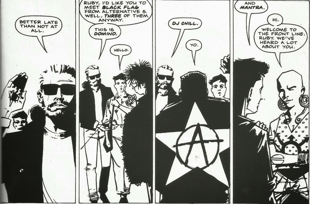 An anarchist supergroup Black Flag (named after the US punk band?) with a UK punk/Jonny Rotten lookalike, Run-DMC/US hop-hop lookalike, seen from the back here, and Mantra, who looks a bit like Sinead o’Connor if you squint.)