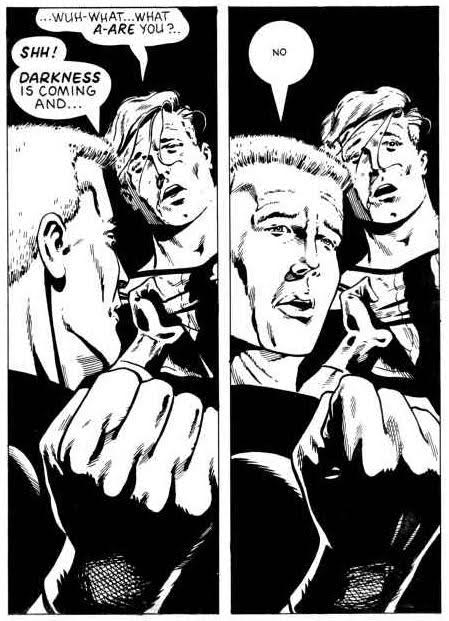 Here’s Siouxsie Sioux, and Dave Gilmour from Pink Floyd (the likeness to Gilmour might be subjective on my part, and informed. by the fact she’s quoting a line from a song on “The Wall” – “what shall we do now, to fill the empty spaces where we used to talk?”). I read somewhere that Morrison liked to inject song lyrics into his writing. BTW I love the art on this page, Steve Yeowell’s brushy command of negative space is superb