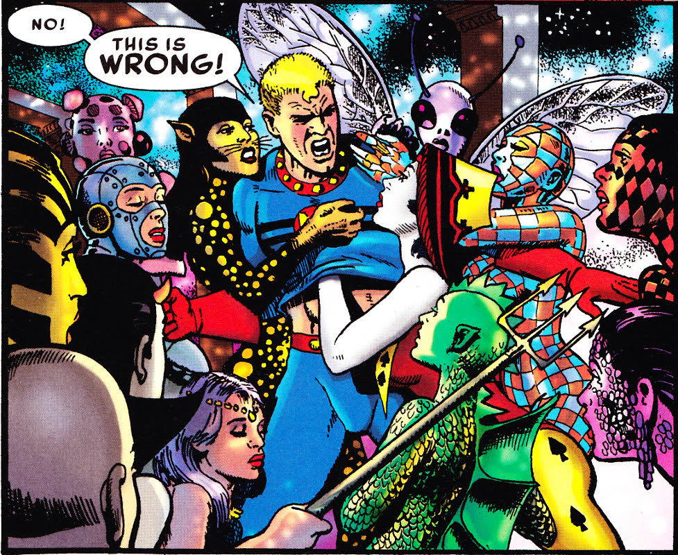 In some sense it’s the difference between moving out and moving in. Zenith’s approach is a superficial one. It takes superheroes as the base unit and then changes the decorations. What if the hero was a narcissist braggart? What if the bad guy was Richard Branson? What if the other bad guys were Lovecraftian monsters? What if the robot was into Acid House? What if the wise leader was a Tory MP? The effects might be new but fundamentals remain the same. It’s only moving outwards.