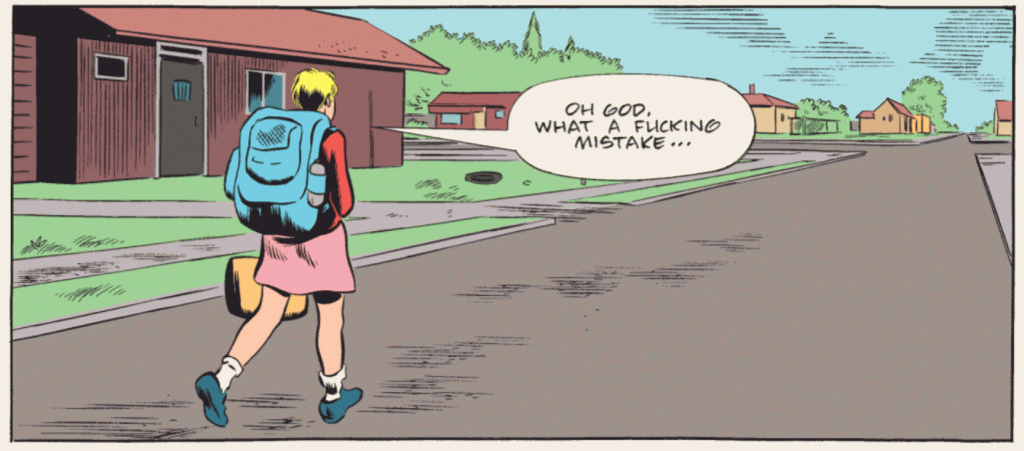 Reading it now tho I can’t say that I’m as impressed (sorry Daniel). Mostly because of – well – how fucking miserable it all is. To the point where reading the whole thing kinda feels like taking a bath in cold tears and sadness (with an extra downpour of despair). And like I’ve gotta say – why do so many people seem to think that this is what “high art” is all about? Like Daniel Clowes might be the most successful creator of this kinda stuff but there’s a whole segment of comic books that has grown up in his shadow behind him and kinda spread itself out like a particularly malignant mould.